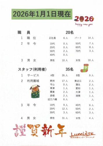 2026-01-01 1月1日現在! 2026年、あけましておめでとうございます。 今年もよろしくおねがいいたします。 関連記事 社会適応訓練 2018年12月1日 紅葉 8月1日現在! 4月26・27・29日 GWモーニング&アフタヌーンティー 7月12日 カルビ大将でスタミナチャージ! 11月12日 竹取物語読み聞かせ会 12月27日 年末恒例大掃除&スシロー!